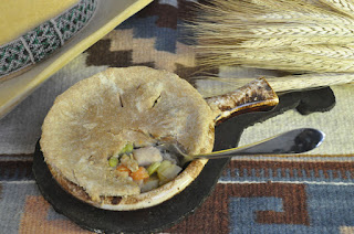 It's been rainy and cold here, so I've been hankering for some comfort food in front of the fire. Chicken pot pie fits the bill. This recipe omits the cream sauce made with cream, butter, and flour and uses mashed potato flakes as a thickener. If you don't like potatoes, this can also be thickened with just flour, minus the butter and cream. The crush has been healthied up a bit, too. It uses a combination of whole wheat and all purpose flour, and has been reduced to just a top crust. The pictures reflect my mood for "hankering" - somehow the word reminds me of a western theme.